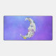 Ce tapis de bureau a une lune mystique de croissant blanc avec un visage et décoré de formes abstraites colorées fantaisie en bleu, jaune et violet sur un bleu brumeux et violet ciel arrière - plan avec étoiles.