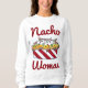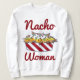 Il présente une illustration originale d'un plateau de nachos garni de fromage, de crème aigre et de poivrons, et de NACHO WOMAN dans une police rouge amusante.