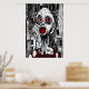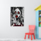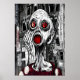 Un art noir, blanc et rouge fait tomber une personne malade et effrayante avec les yeux rouges et la bouche avec un bâtiment dans l'arrière - plan. C'est un art généré par l'IA.