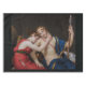 L'Adieu de Telemachus et Eucharis c1818 du peintre français Jacques-Louis David (1748 - 1825), considéré comme le peintre prééminent du style néoclassique. Ce tableau représente les personnages Telemachus et Eucharis du roman C1699 Les Aventures de Télémaque de l'Archevêque de Combrai François de Salignac de la Mothe-Fénelon (1651 - 1715), inspiré par l'Odeyssey d'Homère. Dans la mythologie grecque Telemachus est le fils d'Odysseus et de Penelope; tandis qu'Eucharis qui ne fait pas partie de la mythologie grecque est l'un des préposés de la nymphe Calypso dans le roman de Fénelon Les Aventures de Télémaque c1699. Dans le tableau Eucharis qui porte une robe d'accent doré rougeâtre avec un accent doré vert émeraude sash autour de sa taille, une bande d'or autour de ses cheveux et un cylindre en laiton avec le nom de famille de l'artiste David dessus. Elle embrasse Telemachus, qui est partiellement vêtu d'une robe bleue aux accents de couronne or le long de son périmètre et a un groupe blanc avec des cercles d'or enveloppés autour de sa tête. Il a aussi une corde attachée sur la poitrine, d'où une corne de laiton est suspendue de son côté droit avec la date de l'oeuvre et les lettres gravées par BRVX, pendant qu'il repose sa main droite sur la cuisse gauche d'Eucharis; tout en tenant une lance à pointes métalliques dans sa main gauche avec son chien blanc le regardant de l'entre la lance et son bras gauche.