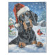 Ce design festif reflète l'esprit joyeux de la période des fêtes, avec un adorable petit portant un chapeau de Père Noël. Le chien est niché dans un pays des merveilles hivernales, avec un bonhomme de neige, un sapin de Noël décoré et des cadeaux joliment emballés. Les flocons de neige tombent doucement, ajoutant une touche magique à la scène, tandis que les couleurs vives des décorations de vacances créent une atmosphère chaleureuse et joyeuse.