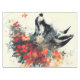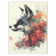 Portrait mystique de renard noir et blanc entouré de fleurs vives et colorées.