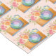 Une nappe avec un motif extensible avec une aquarelle illustrant une caméra orange et un bouquet floral posé sur le dessus. Les fleurs du bouquet sont rose clair et orange avec des feuilles verts, un joli arrangement floral.