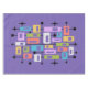 This artwork radiates mid-century modern energy, layering vibrant rectangles and squares of orange, green, blue, pink, purple, and white within a black grid of lines and dots. The composition is punctuated by playful black starbursts, evoking the optimism of the atomic age. Set against a deep purple background, the symmetry and bold color contrasts create a dynamic rhythm that feels both retro and timeless. The piece captures the spirit of 1950s–1960s design while offering a fresh, contemporary vibrancy.