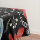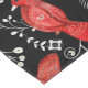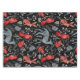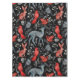 L'illustration sur fond noir présente des oiseaux rouges et bleus à motifs, un lapin et un cerf parmi des motifs floraux blancs, créant un style fantaisiste d'art populaire.
