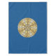 Un mandala en forme de dentelle concentrique en bleu foncé avec des points bleu vif et dorés comme des étoiles qui s'étalent entre les couches et un cercle en dégradé de soleil brillant derrière fait un design amusant qui rappelle un ciel étoilé et une journée ensoleillée brillante avec une image.