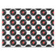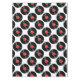 Un disque vinyle LP cassé avec un étiquette rouge et un cercle de touches de piano sur un arrière - plan blanc.