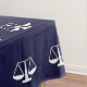 Décoration de nappe de fête d'avocat ou de diplômé de faculté de droit avec motif de balance de la justice sur fond bleu marine.