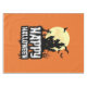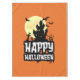 Happy Halloween dessin de texte avec maison hantée, de cimetière et de chauves-souris décoration à pleine lune sur arrière - plan orange