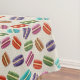 Une nappe avec un mignon motif de macarons dans de nombreuses couleurs différentes avec un faible motif à pois derrière.