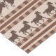 Ce motif audacieux met en valeur des silhouettes de chevaux au galop dans des tons bruns riches, disposées en rangées horizontales répétitives. Le design est accentué par des bordures de style damier et des rayures alternées dans des tons chauds de tan, beige et châtaigne. Les figures dynamiques de chevaux capturent le mouvement et l'énergie, tandis que la disposition structurée des rayures ajoute du rythme et de l'équilibre. Avec sa palette terreuse et son charme rustique, ce design allie des thèmes inspirés de l'Ouest à un style folklorique classique, ce qui en fait un choix frappant pour les amateurs de motifs équestres et campagnards.