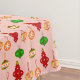 Nappe dans un motif d'ornements anciens de Noël assortis, en rouge profond, vert foncé, or doux et rose, contre un arrière - plan rose pêche doux