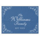 Nom de famille personnalisé marine bleu et blanc tissu de table pour la fête du dîner. Nappe noire et blanche avec élégants tourbillons tourbillonnant fleuris. Décor vintage de maison classique pour mari et femme couple / marié et marié marié nouveaux mariés. Stylish calligraphie typographie avec nom de famille personnalisable. Idée cadeau sur mesure pour mariage classe, fiançailles, baby shower, nouveau bébé, anniversaire, anniversaire, fête du ménage, réunion etc. Décor intérieur assez chic pour la réception/salle à manger. Faites votre propre avec votre nom de famille et l'année établie sur mesure. Est. 20XX. Créez votre propre mariage pour les jeunes mariés, mariés, mari et femme, mariés et mariés, les siens et les siens, monsieur et madame, grands-parents, jeunes mariés, etc.
