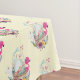 Une nappe à motifs avec un joli tableau aquarelle d'un oeuf vert pâle assis à l'intérieur d'un panier d'osier. Décoré de rubans, arcs, fleurs et petits coeurs. Flamingo rose et lapin lapin blanc à côté.