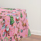 Christmas-themed pattern featuring Santa Claus, reindeer, snowmen, elves, Christmas trees, candy canes, and snowflakes on a pink background