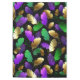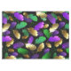 Seamless pattern of bright purple, green, and gold feathers on black Mardi Gras background. Design for the Mardi Gras holiday.