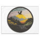A broder with an eagle flying over a mountain, in the style of contemporary landscape, golden light, black mountain college, fisheye lens, arts and crafts movement, mid-century illustration