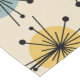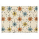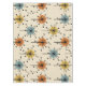 A mid century moderne pattern with geometric shapes of colorful abstract flowers and sputnik starbursts.