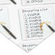 VODKA SHOPPING LISTCocktail Humour. Graphique humoristique d'une liste d'achats avec 7 bouteilles de vodka et juste un pot d'olives sur elle accentué avec une tache de tasse de café et un stylo de repos.