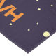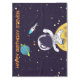 Toile de table d'anniversaire avec un arrière - plan bleu foncé aux étoiles jaunes éparpillé autour. Couché sur le dessus est l'illustration d'un astronaute vêtu d'une combinaison blanche flottant au-dessus de la lune. Au loin se trouve une planète avec des anneaux et un vaisseau-fusée qui s'envole dans le ciel à la recherche de nouveaux mondes à explorer.