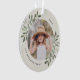 Cette saison des Fêtes, commémorez une année spéciale avec cet élégant ornement de Noël photo personnalisée. Des sprigs gracieux d'aquarelle peinte en vert muet encadrent votre photo, avec votre nom et l'année qui tourne autour. Ajoutez une deuxième photo au verso.