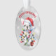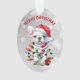 Sur ce joli ornement de Fêtes, un adorable petit Chien à tête blanche est entré dans les décorations de Noël ! Il est enveloppé de lumières, et les ornements se trouvent à ses pieds. Le chien porte un chapeau de Père Noël rouge et blanc. Le texte au-dessus de l'image dit "MERRY CHRISTMAS" en rouge. L'image et le texte sont placés sur un arrière - plan de livre abstrait argenté. Le fond de l'ornement a la même image, mais avec le texte "HAPPY NEW YEAR" en vert.