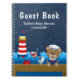 Ce livre d'hôtes mignon et amusant présente un ours marin sur une terrasse en bois avec un mouette et un crabe. Dans l'arrière - plan il y a un phare rouge et blanc, un oiseau mignon sur un voilier, des vagues de l'océan et un ciel étoilé bleu marine. Le texte combine des polices audacieuses et serif pour un look élégant et moderne. Parfait pour un baby shower à thème nautique.