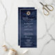 Ce programme de mariage moderne de bateau nautique est parfait pour une croisière ou un mariage sur la plage. Le design simple comprend une roue de bateau doré sur un arrière - plan bleu marine aquarelle. Inclure le nom de la mariée et du marié, la date et le lieu du mariage, le message de remerciement, l'ordre de service, la fête de la mariée et un mémorial optionnel "en mémoire d'amour".