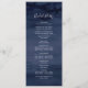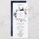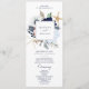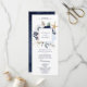 Ce programme moderne de mariage floral nautique est parfait pour une croisière ou un mariage sur la plage. Le design fantaisiste présente des fleurs d'aquarelle rose pâle et bleu marine aux accents d'étoile d'or, donnant une ambiance de plage. Inclure le nom de la mariée et du marié, la date et le lieu du mariage, le message de remerciement, l'ordre de service, la fête de la mariée et un mémorial optionnel "en mémoire d'amour".