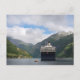 Carte postale d'un grand bateau de croisière dans l'étroit Geirangerfjord avec de grandes montagnes le long du fjord, vue du village de Geiranger en Norvège.