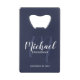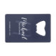 Ajoutez une touche personnelle à votre mariage grâce à l'ouvre-bouteille personnalisé des groomsmen carte de crédit. Ce ouvre-bouteille contient le nom des groomsmen personnalisées en style de police de script moderne blanc et monogramme en style de police de script moderne bleu clair en arrière - plan avec titre et date mariage en blanc moderne sans serif style de police sur arrière - plan bleu marine. Aussi parfait pour le meilleur homme, père de la mariée et plus.