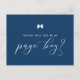 Jolie page d'accueil parisienne carte de proposition garçon. Demandez à votre famille et à vos amis de faire partie de votre mariage avec cette carte personnalisée "Serez-vous mon garçon de page". Il dispose d'un arc et un script élégant. sur un arrière - plan bleu marine Personnalisez en ajoutant un nom et un message