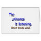 Ce slogan drôle vous rappelle que quoique ce pet que vous vous êtes juste échappé a été censé être du silencieux mais la variété mortelle là est quelque chose qui sait toujours quand vous passez le gaz, n'importe comment discret vous êtes. Le texte du graphique indique : "L'univers écoute. Ne cassez pas le vent." Les couleurs des mots sont bleues et oranges.