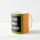 Ce dessin de tasse comporte l'instruction "NE TOUCHEZ PAS CETTE MUG!", ainsi que des rayures noires et jaunes, et des régions d'orange solide.