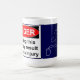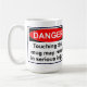 Danger ! Le contact de cette tasse peut avoir comme conséquence la blessure sérieuse. La tasse drôle avec un avertissement se connectent un côté, et le contour d'un corps se situant dans la craie touchant le contour d'une tasse dans la craie de l'autre. L'arrière - plan est un gradient de bleu-foncé à noircir. Grand cadeau de bureau !