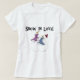 Deux hommes de neige portant des foulards d'hiver tiennent un coeur rouge et le texte dit Snow in Love on snowman design holiday t-shirts, sacs fourre-tout, cartes, autocollants, magnets, et d'autres vêtements et cadeaux de design snowman.