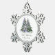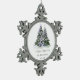 Cet élégant ornement en céramique de sapin de Noël présente de beaux arbres de Noël pourpres et verts ornés de verres et entourés de cadeaux enveloppés. L'ornement inclut également le message MERRY CHRISTMAS dans une police élégante. Personnalisez l'ornement en ajoutant votre nom de famille et l'année.