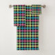 en vichy motif avec rose, vert, bleu, jaune et noir.