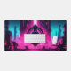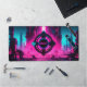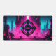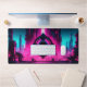 Supercharge your gaming setup or programming workstation with a desk mat that radiates pure dystopian energy. This massive horizontal canvas flawlessly showcases a breathtaking, neon-drenched cyberpunk industrial city. At the very center of the composition, a futuristic mechanical eye floats above the skyline, glowing with the iconic, rebellious word "OBEY". The intense contrast between the vibrant magenta city lights and the electric cyan sky perfectly captures the highly sought-after 80s synthwave and modern cyberpunk aesthetics.