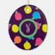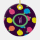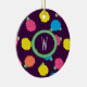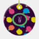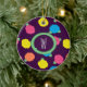Des roses stylisés en rose néon, bleu, jaune et corail avec des feuilles vert néon sont répartis sur un arrière - plan violet profond pour créer un motif floral amusant. Customisez le monogramme sur ce ornement avec votre initiale pour en faire le vôtre.