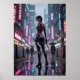 Elégance mortelle dans une ville qui ne dort jamais. Cette affiche cinématographique présente une femme assassin élégante vêtue d'un costume en latex noir, brillant avec des coutures en néon rouge. Elle saisit deux poignards en forme d'épines roses, sur le point de frapper sous l'éclat pluvieux d'une ville cyberpunk. Des panneaux lumineux, des flaques chatoyantes et une toile de fond grasse créent la scène idéale pour cette scène stylisée. Avec un équilibre de danger et de beauté, Neon Thorns est parfait pour les fans de futuriste noir, d'esthétique animée et de piste féminine badass. Une impression atmosphérique audacieuse qui électrifie n'importe quel mur.