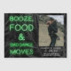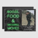 Un cool et décontracté sauvez la date, avec le panneau vert néon disant, booze, nourriture & mauvaise danse bouge sur le palmier noir feuille arrière - plan tropical. ajoutez une de vos photos préférées.