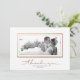Customisez cette carte plat horizontale design moderne en Merci blanc, conçue avec du texte écrit à la main, merci sous une photo horizontale en faux cadre en cuivre. Simple et élégant moyen de dire merci. Veuillez noter que le cuivre est une impression couleur et qu'il n'est pas en fait de couleur ou de feuille métallique. L'arrière a un libellé : "Merci tant pour partager notre journée spéciale et célébrer ensemble le début de notre nouvelle vie. Nous apprécions vos voeux et votre don attentionné." Ce texte est entièrement personnalisable. Remplacez toutes les informations et l'image du modèle par la vôtre. Si vous avez besoin de modifications supplémentaires, cliquez sur le bouton Customiser ! ou contactez le concepteur. Pour de meilleurs résultats utiliser une image haute résolution, il peut être dans les couleurs, mais ce design semble particulièrement chic quand la photo est noir et blanc. *Crédits photo Modèles © par Timothy Marsee
