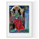 Coloré, vibrant, peinture contemporaine en or, bleu, rouge, vert, couleurs marron. Un mystérieux sorcier hypnotique avec d'élégants costumes de velours rouge tenant une sphère magique assise sur un trône gothique avec des gargouilles et une chouette. Ambient est surréaliste, fantastique, alchimique où vous voyez un bouchon boire d'une tasse, un moine tempéré volant sur une grenouille, bulles transparentes, paysages d'imaginaire avec feu d'enfer, ciel bleu cosmique avec étoiles, montagnes du ciel, arbres.Egg Tempera sur panneau en bois avec feuille d'or. 1989, Miniature Fabriquée avec des techniques picturales de 1300 par Alessandro Lumini (c) C'est aussi un beau design d'imaginaire pour Noël, Fête, Anniversaire, Jour de la Saint-Sylvestre, Mardi Gras et salutations carnavales.