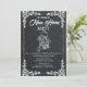 Featuring a stylish chalkboard background with classic white typography and a charming house key illustration, this design is perfect for welcoming friends and family to your new home.