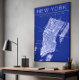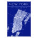 This modern blueprint-style poster features a detailed street map of New York City in white lines over a deep navy background.
