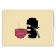 Adorable petite ninja habillée en noir est assise sur des pattes croisées près d'une grande tasse de café vapeur. L'épée katana japonaise est attachée sur le dos.