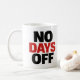 Fuel your ambition from the minute you wake up with the "No Days Off" mug! This design features a powerful, bold, minimalist typography statement in high-contrast black and red. It's a clean, punchy way to remind yourself and others about the hustle required to achieve goals.