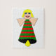 Ce puzzle impressionnant présente un joli Ange de Noël aux cheveux blonds, yeux bleus et un grand sourire. Son corps est une cloche festive de couleur verte et rouge avec un clappeur jaune au fond.