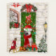 Sibérien Husky Dog Noël assis à l'extérieur de la maison décorée avec la couronne de Noël, sapin de Noël est une idée cadeau de Noël parfait pour les amoureux de les chiens.
